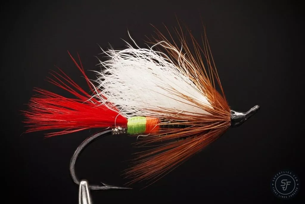 Tämä Butterfly-tyylinen nätti lohiperho on sidottu Partridge M -yksihaarakoukkuun.