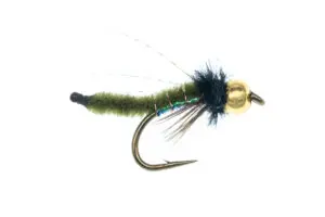 Olive Caddis Beadhead with lively soft CDC & Partridge hackle. Works great as a subdues attractor fly for those times when you are not quite sure what the fish is feeding on.