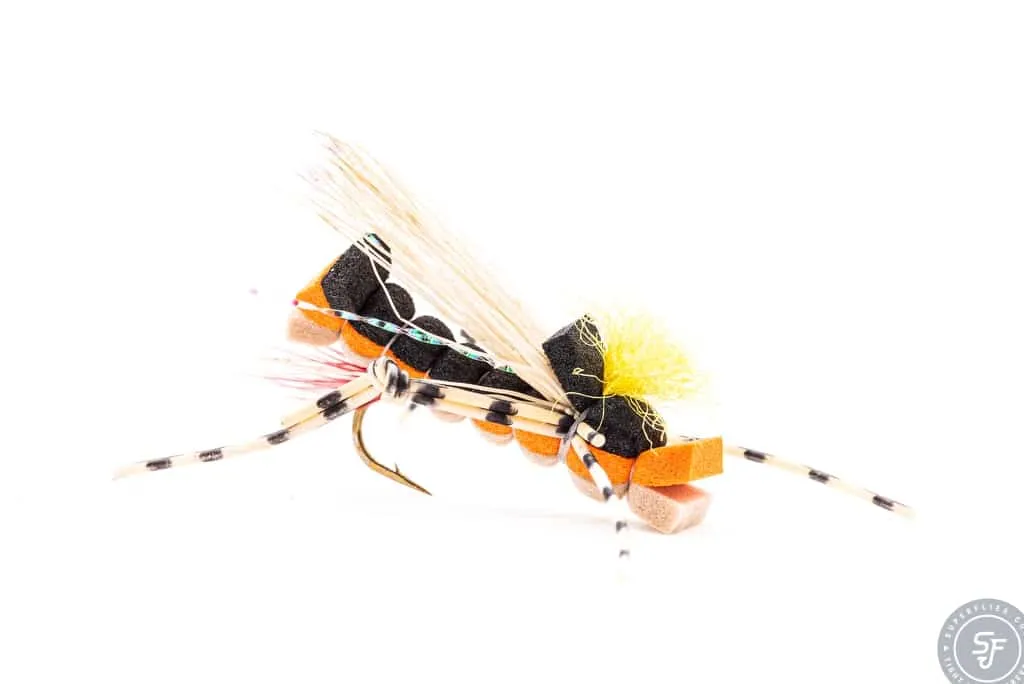 The Streambank Hopper is a high-floating and durable terrestrial dry fly. Its realistic looks and seductive moves are irresistible for trout and other fish that are into bugs like these. Tied on a Daiichi 1710 hook.