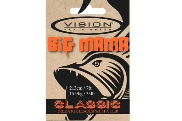 Big Mama Classic ready-made predator leader has a 50cm wire leader made from Vision Wireline (35lb) attached to a 160cm long fluorocarbon leader. They are attached with a tippet ring. This makes it easy to change the wire tippet when needed. The overall length of the leader is a bit over 2 meters. It has a Mustad’s Fastach clip.
